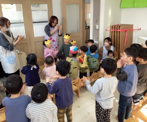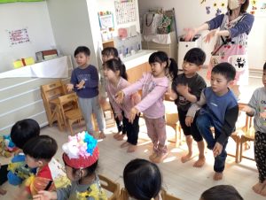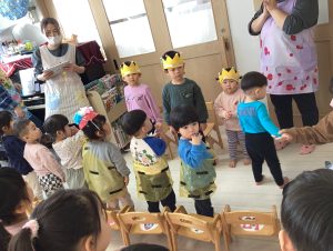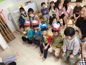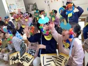 お誕生児のお友だちが席に戻ると、次は節分会👹