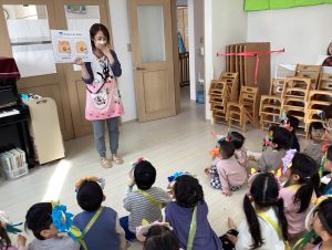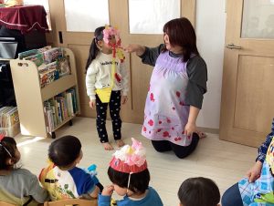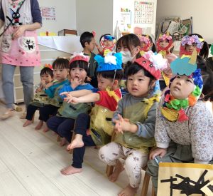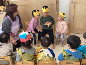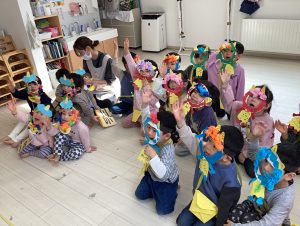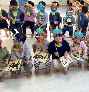 始めに各クラスのおめんや豆入れを代表のお友だちに出てきてもらい紹介してもらいました!
