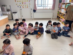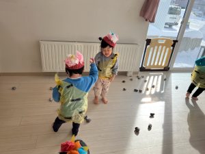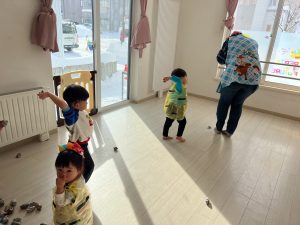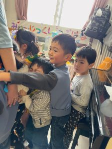 中には鬼に捕まってしまったお友だちもいましたがお友だちが豆を投げてくれて鬼から離して貰えていましたよ!
