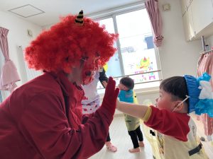 歌の後に「おにわそと~ふくはうち~」と豆を投げる掛け声を練習しているとはな組の奥とはな組のお部屋のドアから鬼が2人も登場!!!!