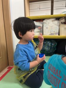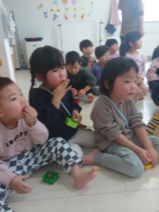 落ち着いてから全園児、給食さんが持ってきてくれた豆がわりのこつぶっこやボーロをぽりぽり…と食べていました😋