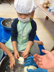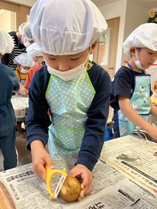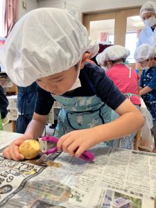 ちゅーりっぷさんは、じゃがいもを洗ったり、ピューラーでジャガイモの皮むきに挑戦しました。