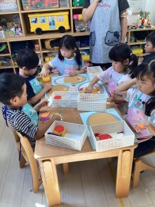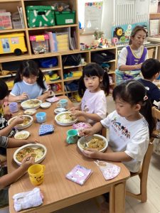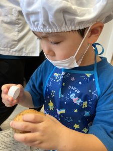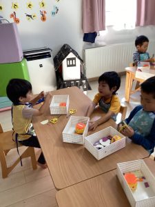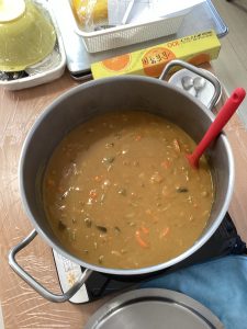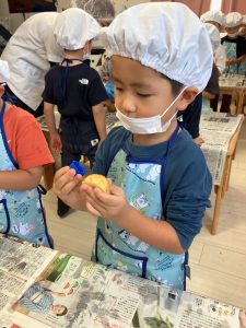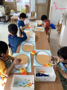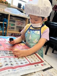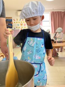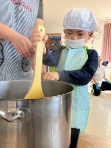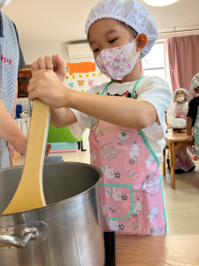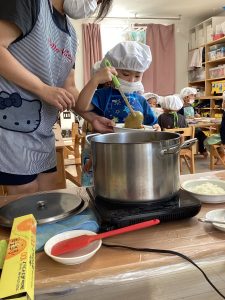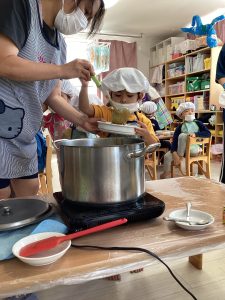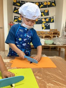 水と牛乳を加えて煮ている間の待ち時間に、紙でカレーの製作をしました。どうやって切るのか、考えながら食材の野菜を自由に切って、カレーにトッピング細長く切ったり、みじん切していたりと、それぞれのカラーが出る彩鮮やかなカレーの完成です🎶
