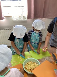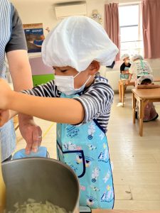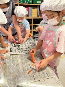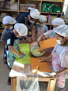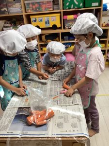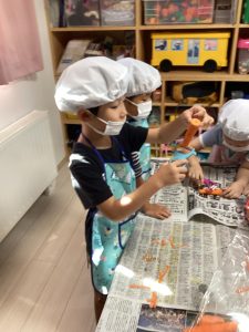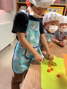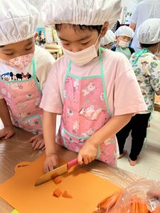 その頃、ひまわりさんは同じくピューラーで人参のい皮むきをしてから、細長く切ってもらった人参とジャガイモを切りました。お楽しみ会で包丁を使ったことのあるひまわりさんは、集中しながらあっという間に大量の食材を切ってくれました😄