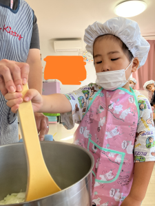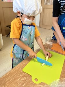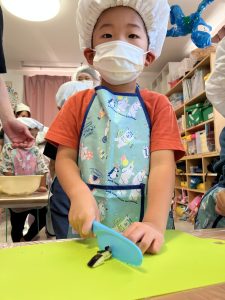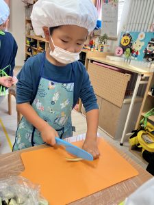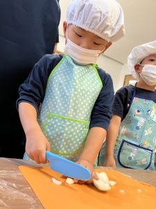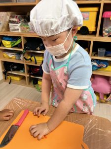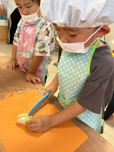 ちゅーりっぷさん、今度は玉ねぎを切っていきます‼️「ニオイするぅ」「目が染みる~」と言いながら、頑張って切ってくれました✨