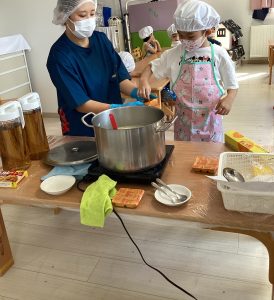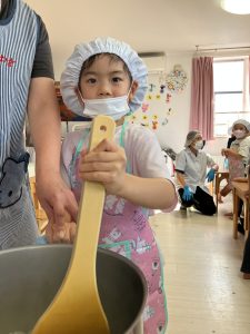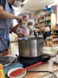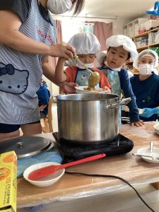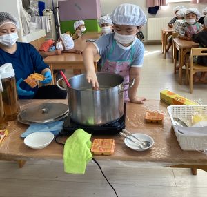 煮えたお鍋が給食室から戻ってきたので、みんなを代表してひまわりさんがカレールーを入れてくれました。