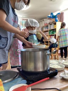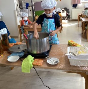 今日は、自分たちで育てて収穫した人参やジャガイモを使ったカレーパーティー                          年齢ごとに工程を分けてクッキングを行いました‼️