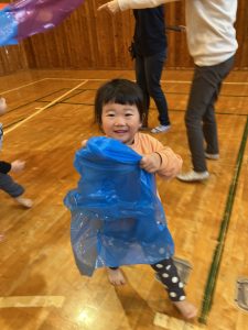 大きなカラーポリをみんなでバタバタしたり、ボールを入れて飛ばしてみたり