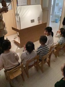 出てきたシルエットを見て「なんだろう?」「○○じゃない?」とお友だちと話ながらクイズに答えてくれていました☺
