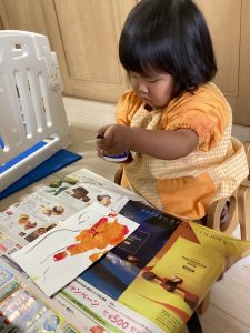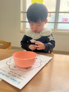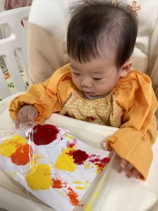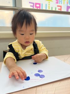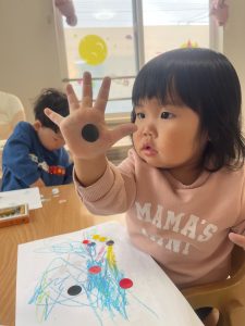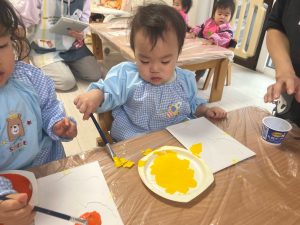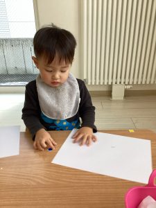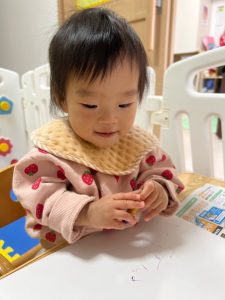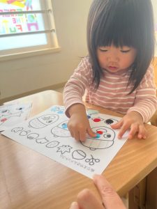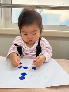 1歳児さんは手先も器用になってきてシール台紙から自分でシールを剥がして紙に貼ることができるようになってきました❣