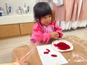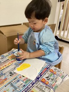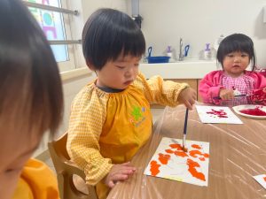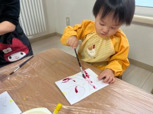 筆や手を使って絵の具を伸ばしたり、紙に自由に色を付けていましたよ😊