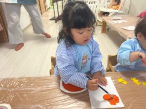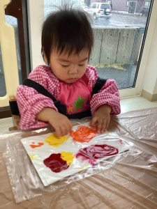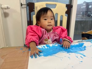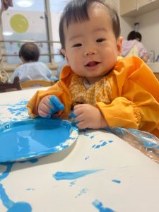 手や顔に絵の具が付いてしまってもへっちゃらでたくさん絵の具を伸ばしていましたよ✨