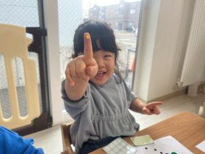 0歳児さんも大きな丸のシールを先生から手渡しで貰うと自分でぺたりと貼ることができるようになってきましたよ(^▽^)/