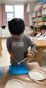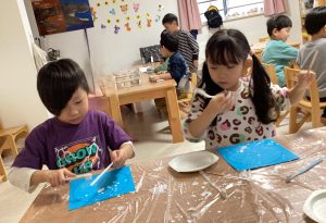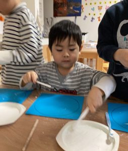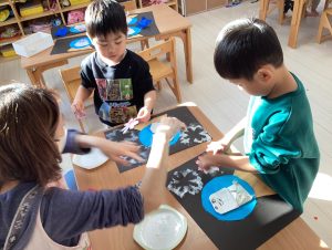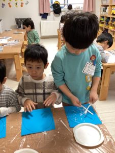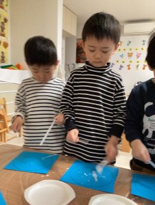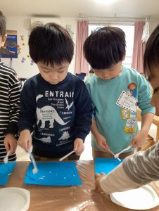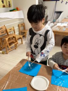 12月の製作はスパッタリングという技法を使ってスノードームの中に雪をふらせました。歯ブラシに絵の具を付けて、棒でこすって絵の具を飛ばします。始めは少し難しかったようですがコツを掴むと上手に綺麗な雪を降らせることが出来ました❄