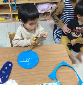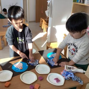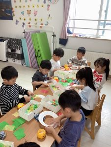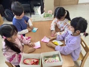 リボンを作るのに捻るのが少し難しかったのですが、年長さんはすいすいと、年中、年少さんは少しお手伝いをするとコツを掴んで上手に作ることが出来ていました( ´∀`)bグッ!