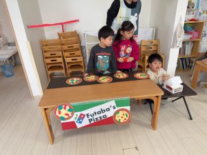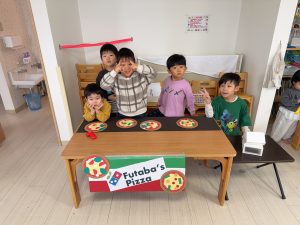 ふたば組さんのお店はピザ屋さん。ピーマンにサラミなどがトッピングされている美味しそうなピザが鉄板の上で焼かれていました。ふたばさんの代わりに、はな組さんが店員さんになってくれました。( ´∀`)bグッ!