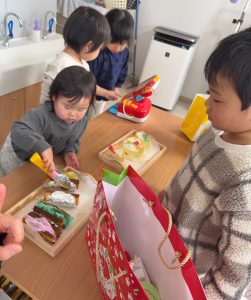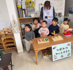 始めのお客様はふたばさん。「いらっしゃいませ」の大きな掛け声がお部屋いっぱいに響き渡る中、大きな袋を持ってお買い物。小さなお友だちが先生と一緒に自分で選んでいる姿はとても可愛らしかったです。