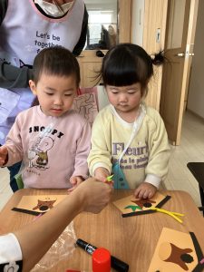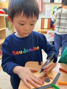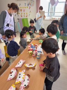 はな組さんは今年のはな組のお部屋のテーマの音楽に合わせて楽器を作りました。カエルのカスタネット、猫とクマのタンバリンだけどマラカスにもなる楽器、そして上下で使える太鼓が並んでいましたよ。