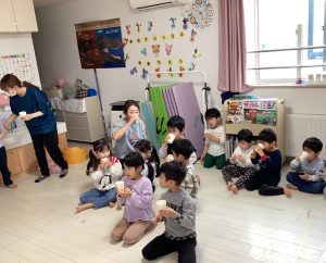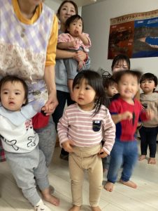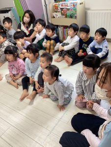 途中でふたば組さん、つぼみ組さんがお部屋に戻りました。戻る時はハイタッチ👐不思議そうに見上げながらも嬉しそうでしたよ😄