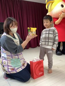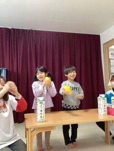 「リボンナポリンのオレンジは何でついていると思う?」との問いかけに、「オレンジ!ミカン!」と答えていたのですが、「実はパプリカの色なんだよ」と聞き、「え~っっっ!」と驚いていました。
