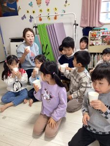 出来上がったレモンラッシーをもらい、みんなで試飲もしました☺️最初はレモン=酸っぱいと感じて躊躇う子もいましたが、「酸っぱくな~い」「美味し~い」との声が♫