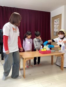 「リボンナポリンのオレンジは何でついていると思う?」との問いかけに、「オレンジ!ミカン!」と答えていたのですが、「実はパプリカの色なんだよ」と聞き、「え~っっっ!」と驚いていました。